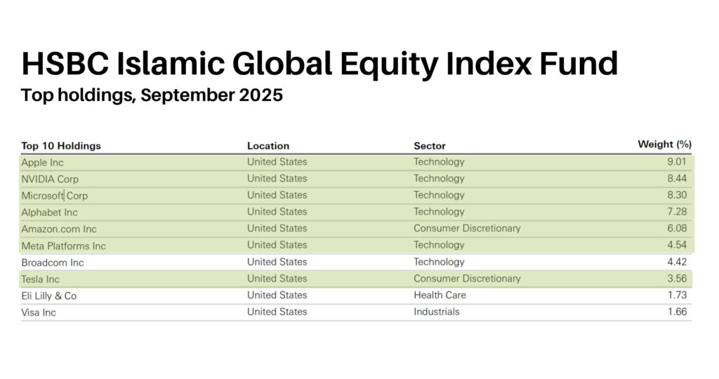 Quite a bit, actually. Many of the funds available under DEWS invest in these companies to varying degrees. Let’s take the HSBC Islamic Global Equity Index Fund as an example (this fund is also available under the GO SAVER Plan).